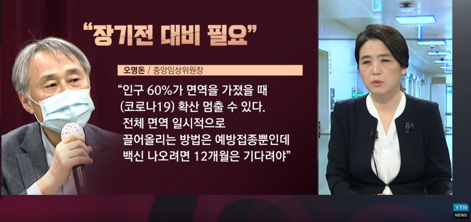 위 사진에 오명돈(중앙 임상위원장)의 말대로 다수가 면역을 가졌을 때 집단면역의 효과를 볼 수 있습니다.