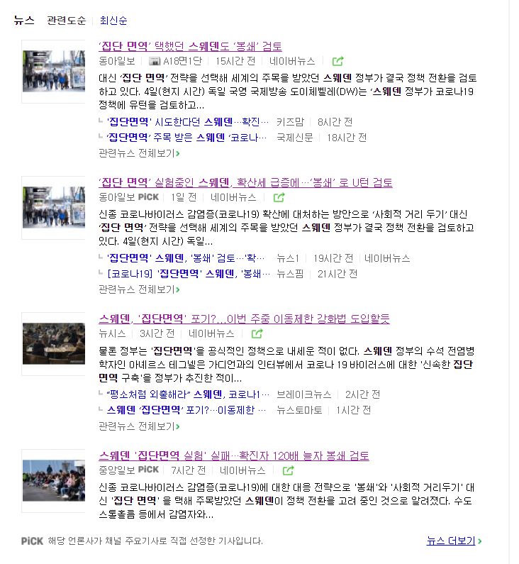스웨덴이 코로나19를 극복하기 위해서 집단면역을 선택했다가 지금 폭망하고 봉쇄를 검토하고 있습니다.